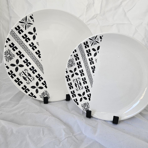 L’assiette Issey marie la pureté du blanc à la profondeur du noir, dans un hommage subtil aux motifs iconiques des tissus wax ouest-africains. Les dessins géométriques, finement tracés en noir, évoquent les spirales, chevrons et symboles ancestraux, emblématiques des parures traditionnelles. Ce contraste épuré fait ressortir chaque détail avec une élégance intemporelle, offrant une pièce idéale pour sublimer vos repas tout en honorant les racines culturelles.